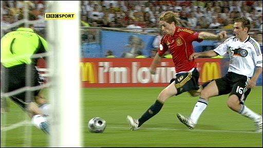 Xavi's laissez passer made uncertainness for Germany withstander Philipp Lahm and Torres shrugged him off the ball to elevate a superb finishing beyond Lehmann.